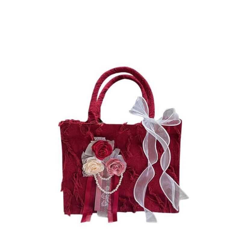 バッグ 手作り フラワー ウェディング ブライダル ハンドバッグ 高級感 レトロ 赤 エレガント スイート 大容量 丸型 キャンバス トート 鞄 日常使い お祝い