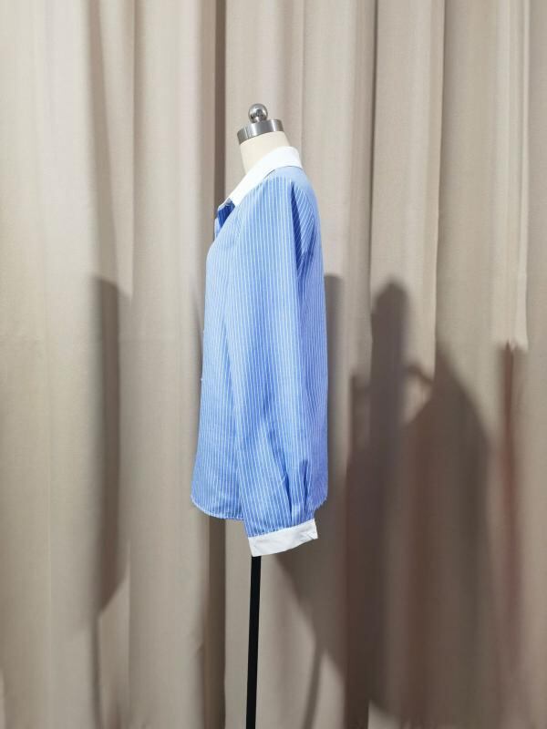 シャツ レディース フレンチスタイル 長袖 ゆったり オーバーサイズ ブルー ストライプ柄 高級感 おしゃれ エレガント きれいめ 通勤 オフィス ミドル丈 襟付き 前開き ポリエステル ストレッチ 春夏