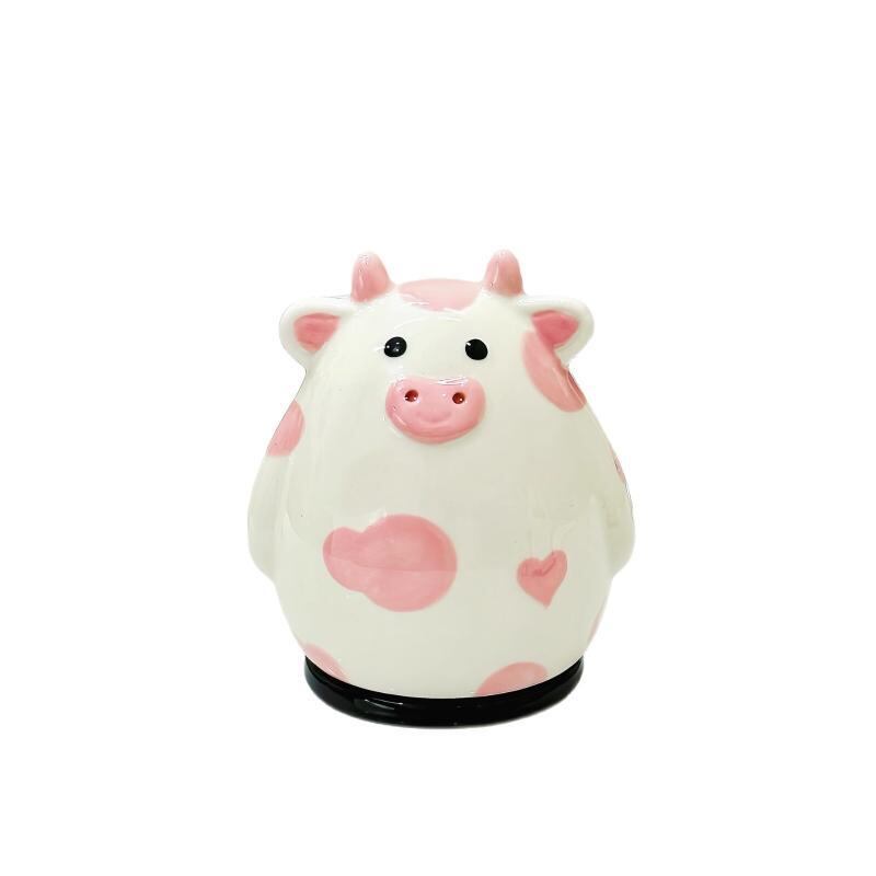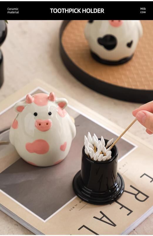 爪楊枝入れ キャラクター 牛 かわいい 家庭用 リビング 卓上 おしゃれ 置物 陶器製 つまようじ 綿棒 歯間ブラシ 収納ケース ブラック ピンク