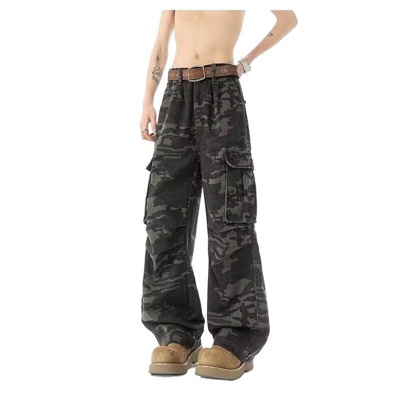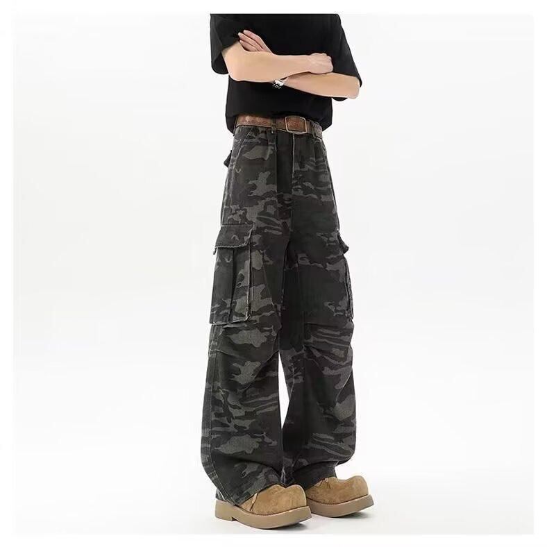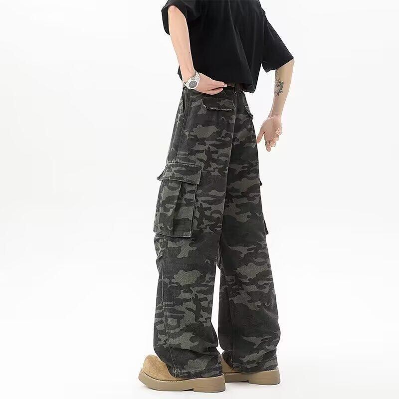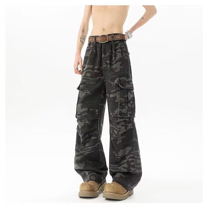 デニムパンツ メンズ 迷彩柄 春夏 アメカジ ストリート系 カジュアル カーゴパンツ ゆったり ワイド マルチポケット ストレート ロング丈 ウォッシュ加工 綿素材 普段使い