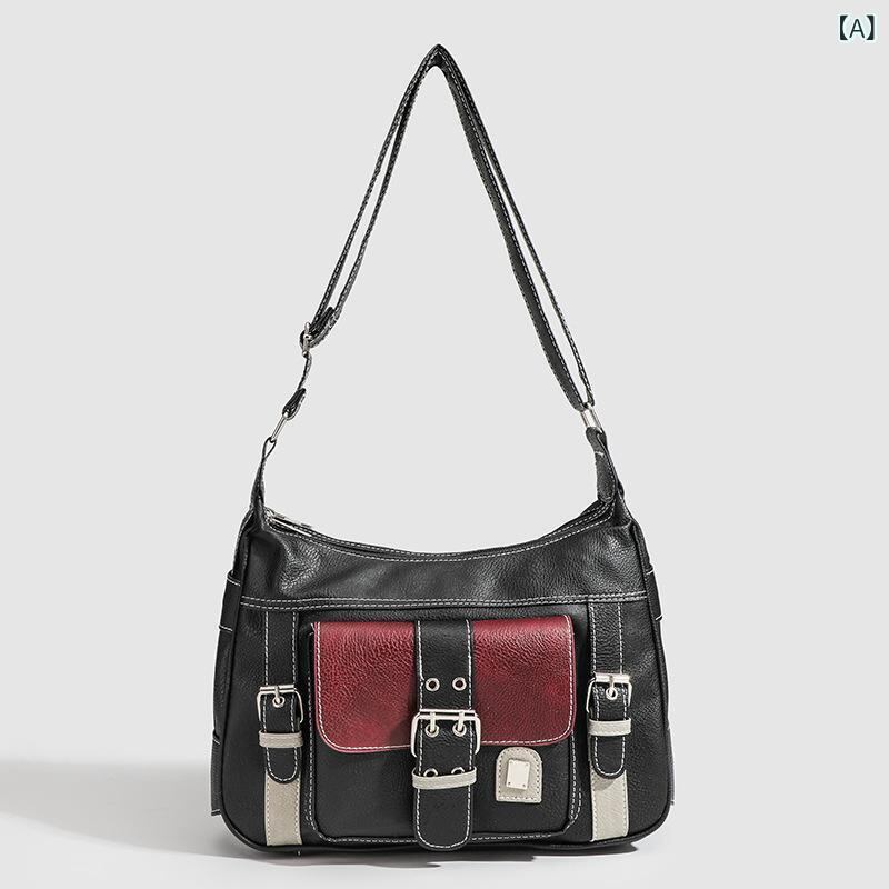バッグ レディース レトロ ヴィンテージ調 個性的 ソフトフェイクレザー ミドルサイズ ハンドバッグ トート ショルダーバッグ 斜め掛け バイカラー ブラック ストリートカジュアル 普段使い ファスナー開閉 横型 スクエア