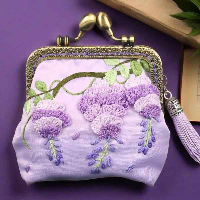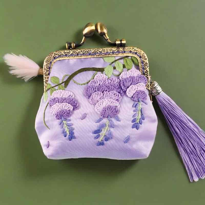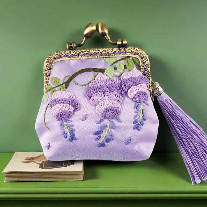手芸キット がま口ポーチ DIY 手作り 初心者 材料セット リボン刺繍 中国伝統 蘇州 古風 藤色 サテン生地 上品 小物入れ コスメポーチ