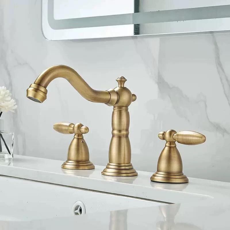 水栓 ヨーロピアン 真鍮製 3穴 混合水栓 ダブルハンドル 分離型 洗面ボウル 洗面台用 高級感 3点セット 電気メッキ加工 アンティークゴールド