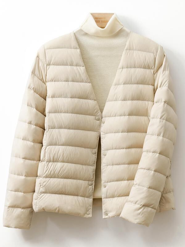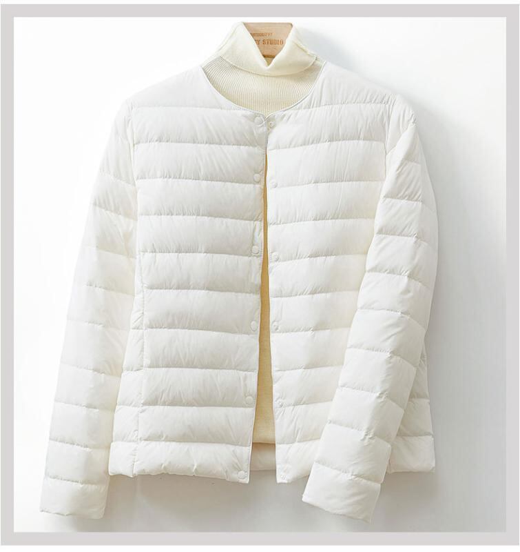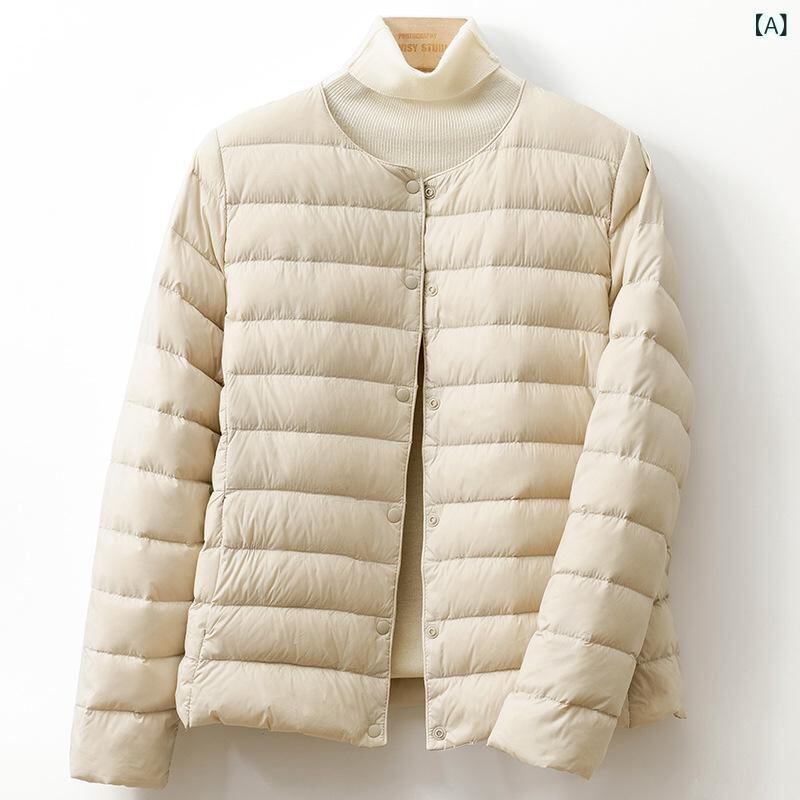 ダウンジャケット レディース ショート丈 丸首 ノーカラー 軽量 薄手 インナーダウン ホワイトダックダウン 羽毛90% ナイロン素材 長袖 ポケット付き シングルボタン 通勤 オフィス 普段使い カジュアル 秋冬