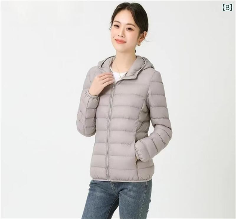 ダウンジャケット レディース 秋冬 軽量 薄手 フード付き キルティング ショート丈 スリムフィット 大きいサイズ 防寒 あたたか ナイロン ダックダウン アウター 女性用 通勤 カジュアル ブラック グレー ベージュ