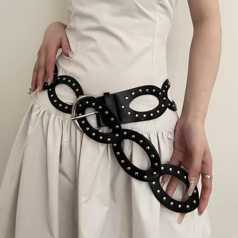 ベルト レディース パンク ロック スタッズ Oリング 透かし彫り フェイクレザー ウエストマーク 欧米風 ストリート ギャル カジュアル 普段使い