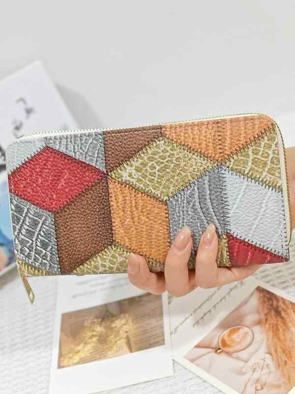 財布 レディース 女性用 長財布 スキミング防止 コンパクト PUレザー 小銭入れ カードケース かわいい 高級感 プリント 切り替え チェック 幾何学模様 シンプル デイリーユース 一つ折り ライトブラウン