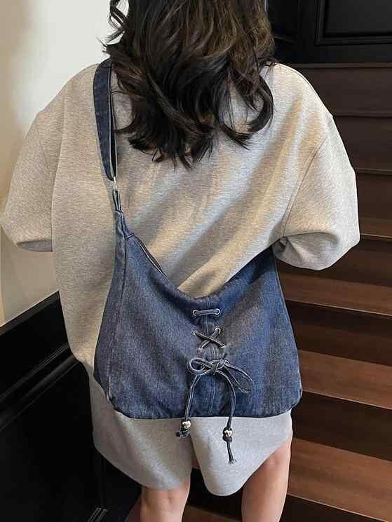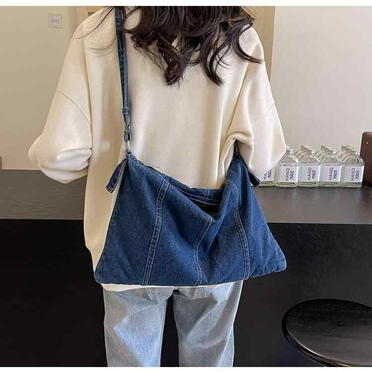 ・カラー展開: ブラック、ライトブルー、ダークブルー・スタイル: 欧米風レトロ・素材: デニム・バッグタイプ: トートバッグ・バッグサイズ: 小・流行要素: ステッチ・裏地素材: ポリエステル・バッグ形状: 横長スクエア・開閉方式: ファスナー・内部構造: 内側ファスナーポケット・硬さ: ややソフト・外側ポケット: 内パッチポケット・ショルダーストラップ: シングル・適用シーン: デイリーユース