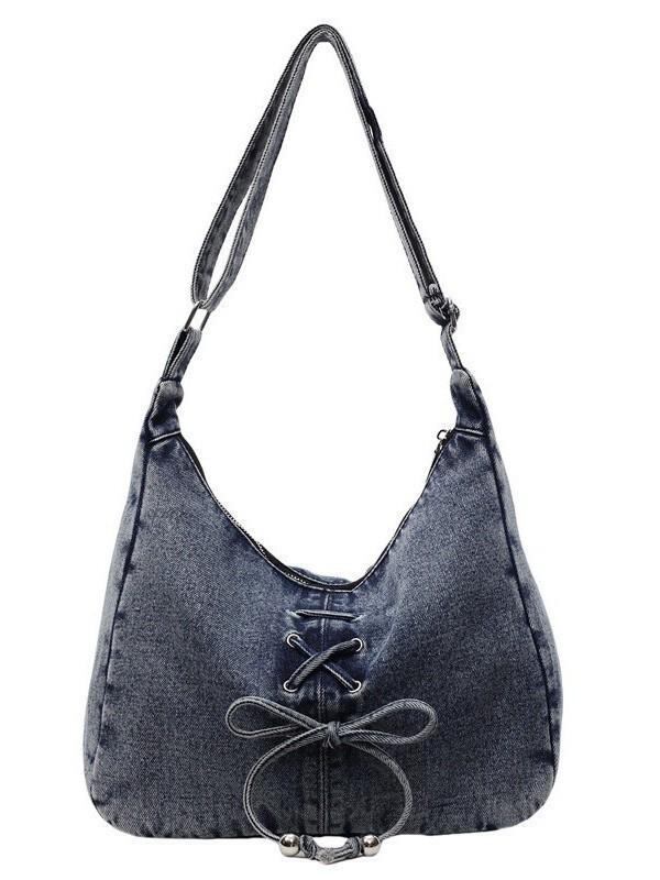 ショルダーバッグ レディース 女性用 デニム生地 レトロ ヴィンテージ 韓国風 リボン 肩掛け鞄 クロスボディバッグ 通勤 普段使い 上品 かわいい 横型 スクエア ミニ 小さめ ファスナー開閉 柔らかい 内ポケット ブラック ライトブルー ダークブルー