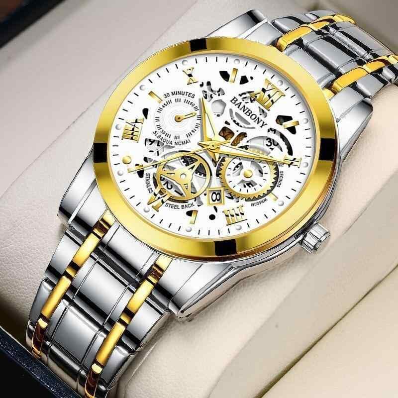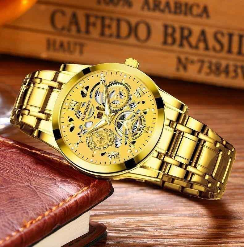 腕時計 メンズ スイス 自動巻きムーブメント 日付曜日表示 夜光 防水 スタイリッシュ 高級感 ステンレスベルト ラウンドフェイス イエロー文字盤 ビジネス カジュアル