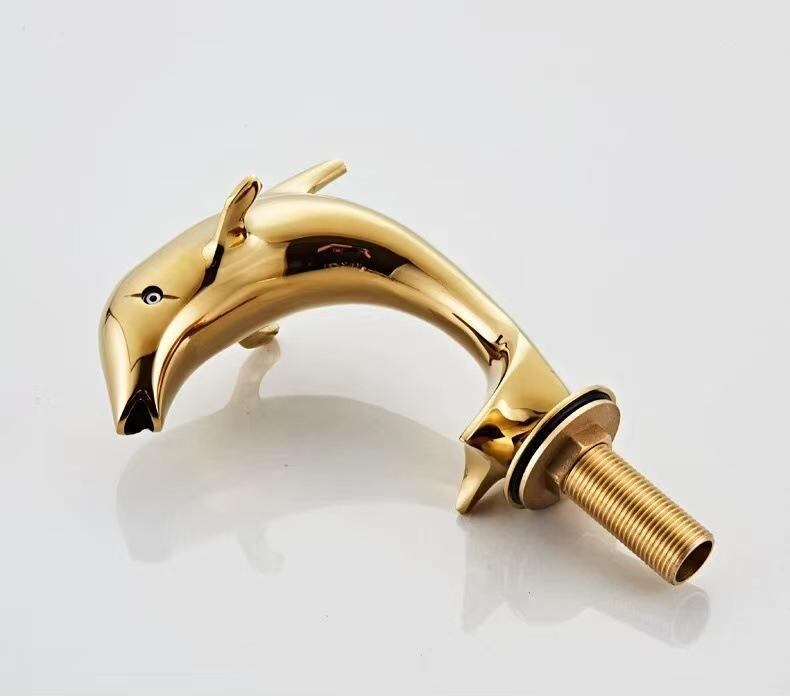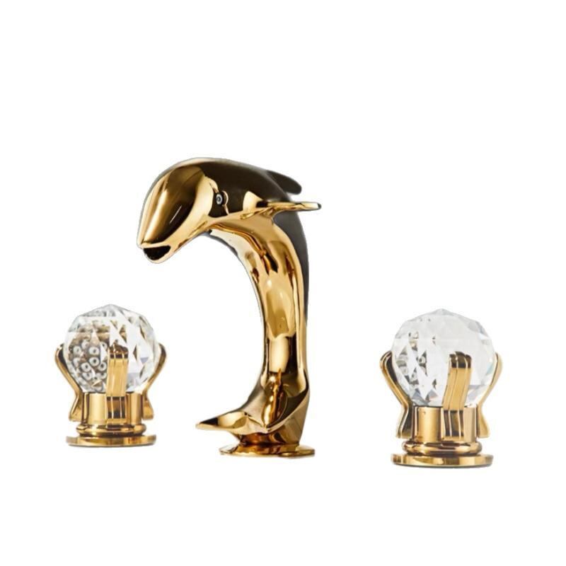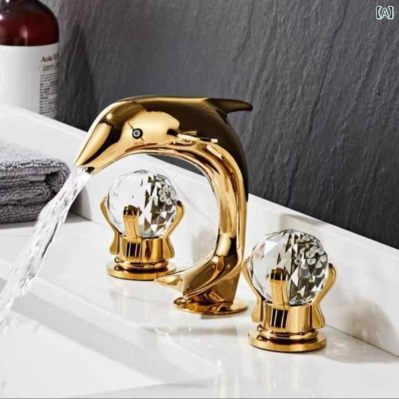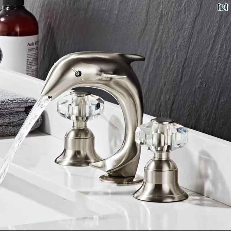 蛇口 真鍮製 イルカ型 ユニークデザイン 冷温水 混合水栓 ダブルハンドル 三穴 家庭用 浴室 洗面台用 置き型 シンプル モダン セラミックバルブ