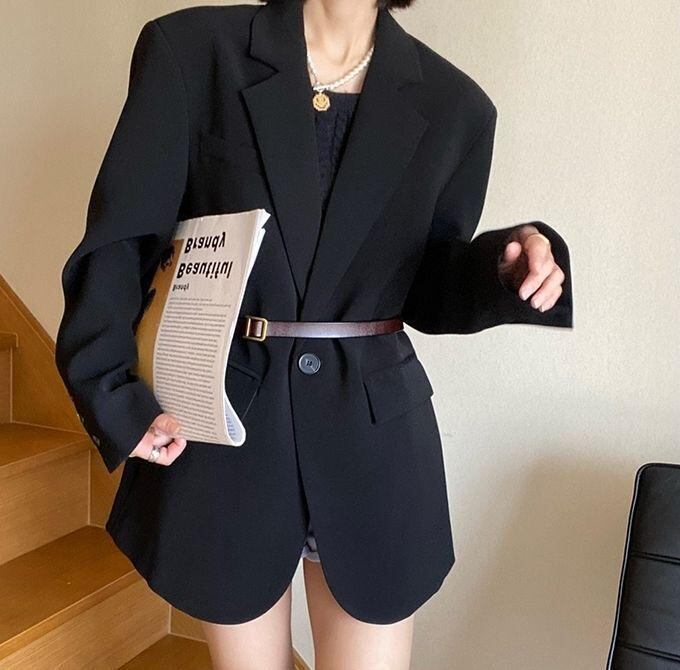ブレザー レディース ブラック 韓国風 シングルブレスト テーラードジャケット 個性派デザイン ゆったり リラックスフィット カジュアル 体型カバー 長袖 ポリエステル アウター 春秋