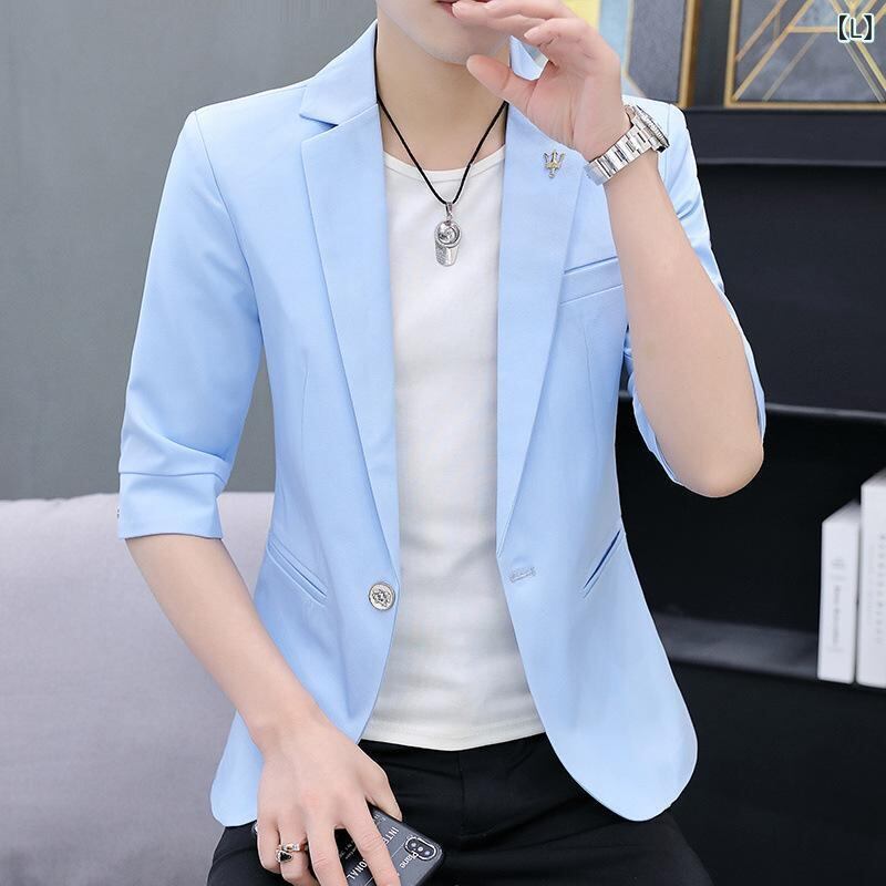 セットアップ メンズ 春夏 七分袖 ジャケット パンツ ツーピース カジュアル 韓国風 スリムフィット 薄手 ノッチドラペル ポリエステル 通勤 普段使い オフィスカジュアル テーラード