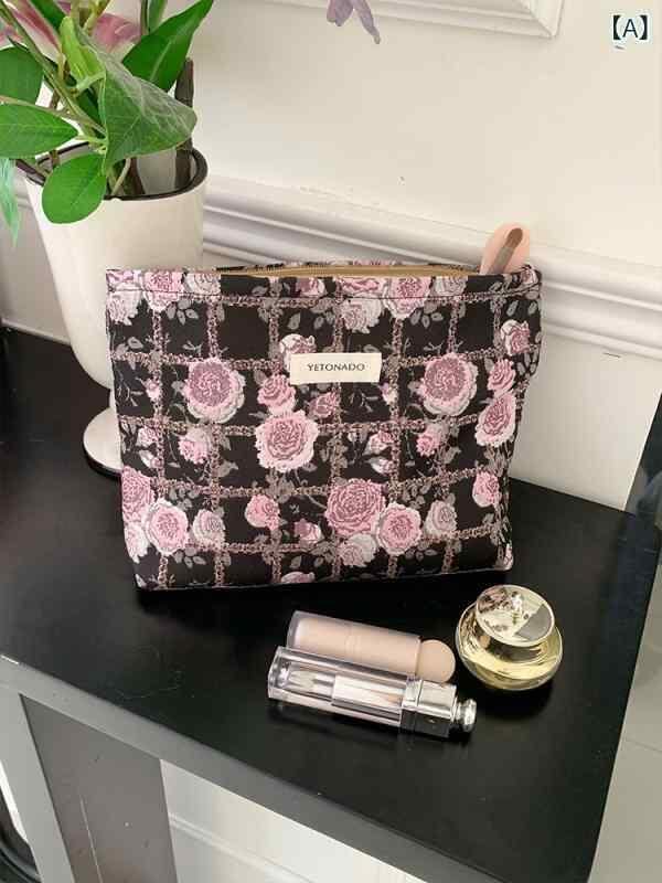 ポーチ レディース 型押し フラワー 花柄 レトロ アンティーク調 大容量 化粧ポーチ コスメポーチ 収納 整理 バッグインバッグ 小銭入れ クラッチバッグ セカンドバッグ 携帯 持ち運び便利 上質 ポリエステル ピンク ローズ チェック柄 刺繡 キャン