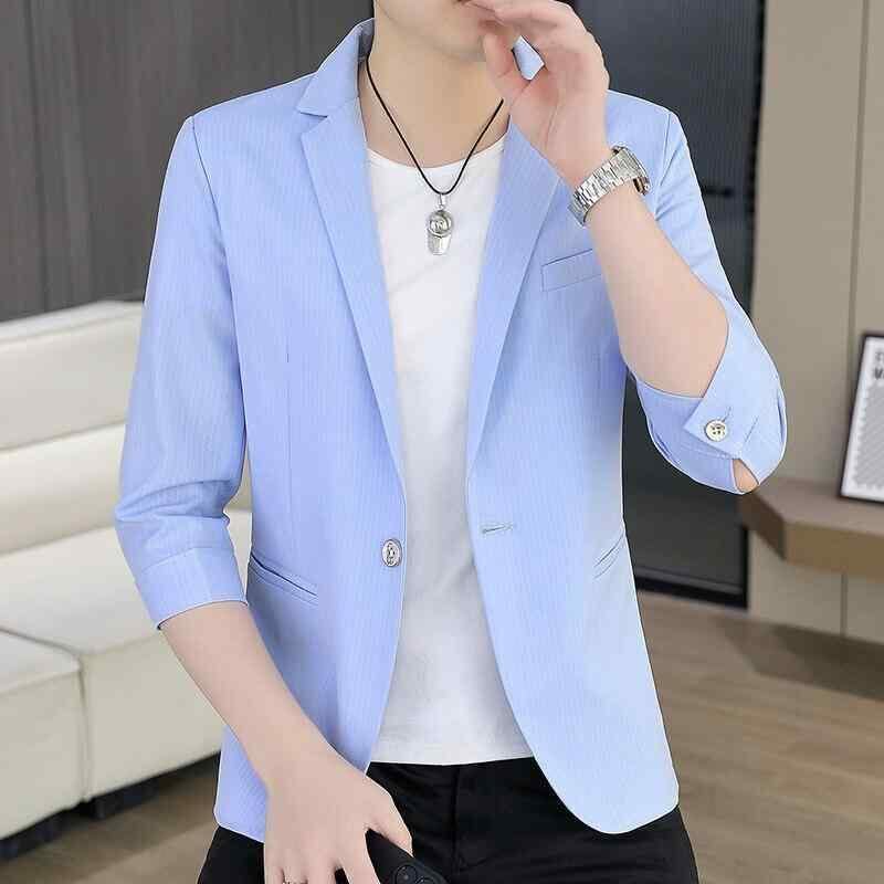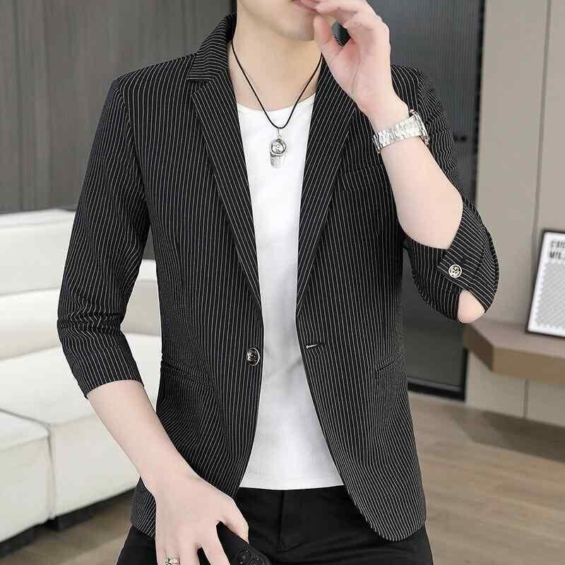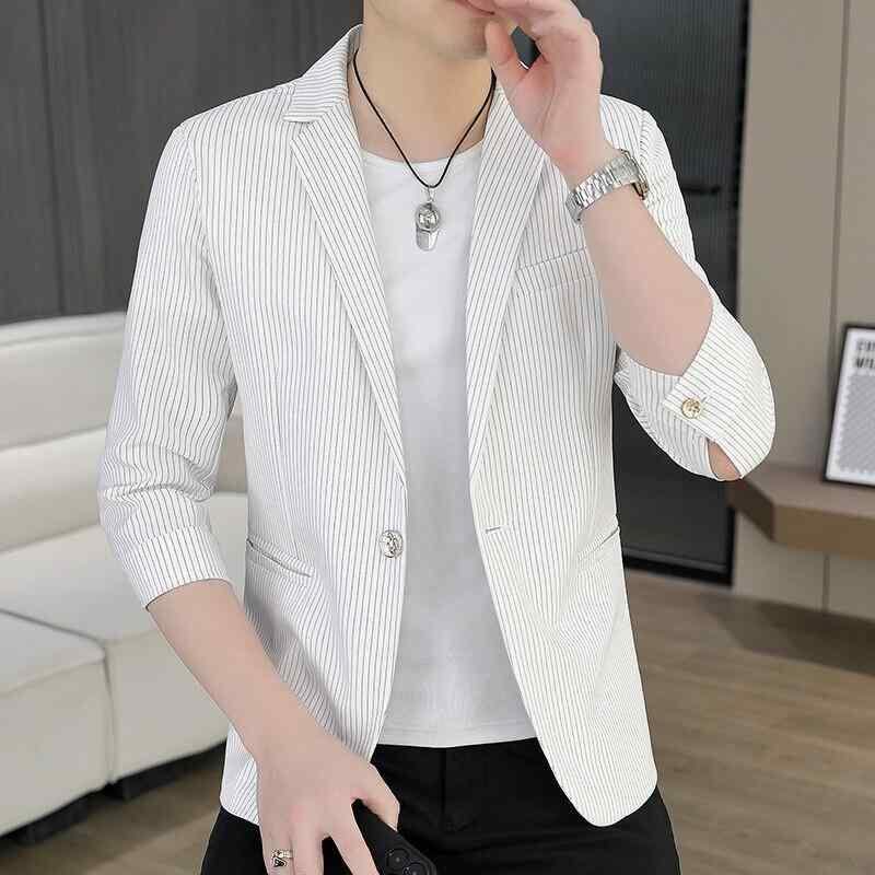 ジャケット メンズ 春夏 ストライプ柄 半袖 七分袖 薄手 軽量 韓国風 カジュアル テーラードジャケット 男性用 ポリエステル素材 シングルボタン