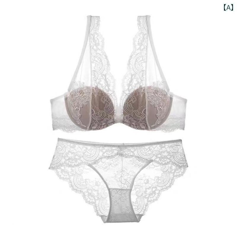 ブラジャー&ショーツセット レディース 春夏 レース 深Vネック フレンチスタイル セクシー フェミニン 大人可愛い 薄手 透け感 寄せ上げ 谷間メイク 着痩せ効果 快適 通気性 バックデザイン 高級感