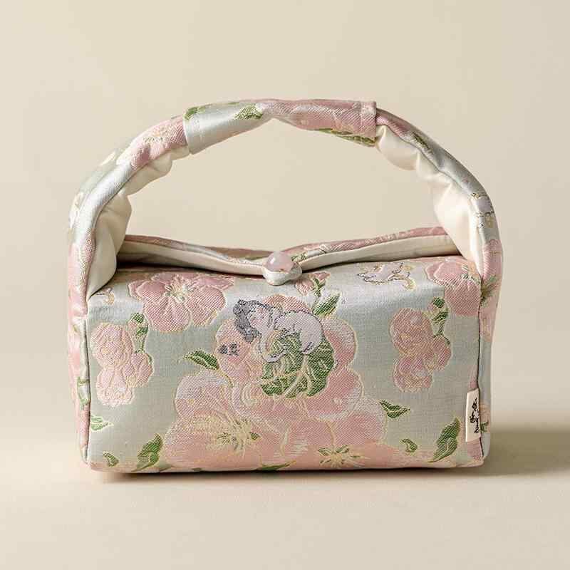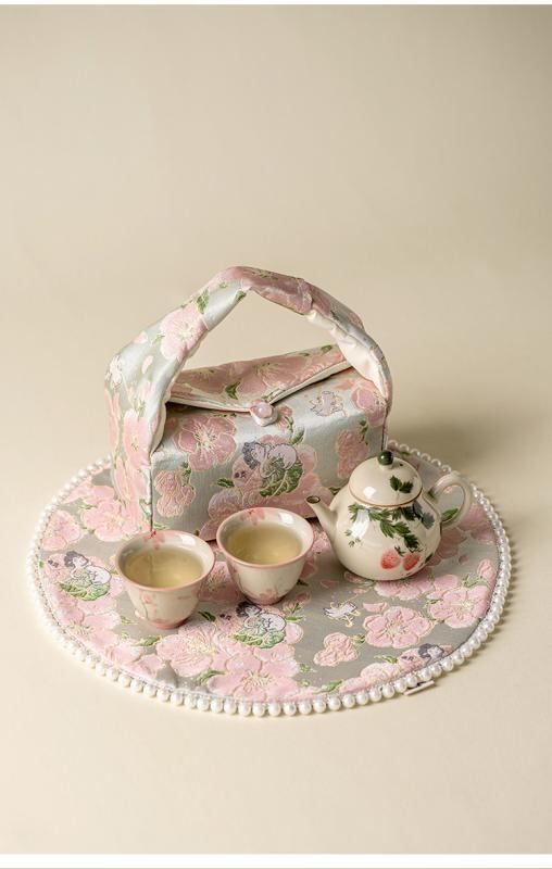 茶道具 収納バッグ 錦織 刺繍 桃の花柄 厚手 布製 持ち手付き ポータブル アウトドア 旅行用 茶器セット 鞄 ポーチ