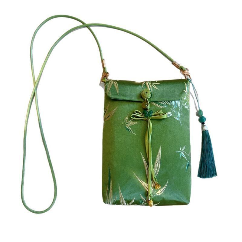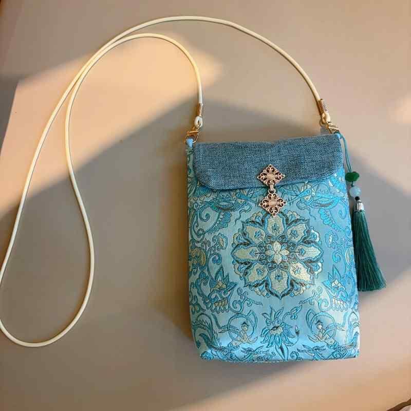 スマホショルダーバッグ ネオチャイニーズスタイル 民族調 ハンドメイド 織錦 刺繍 がま口 コインケース 斜め掛け クロスボディ 縦型スクエア フラップ開閉 ミニ コンパクト お出かけ デイリーユース