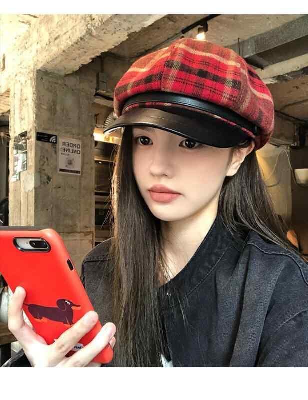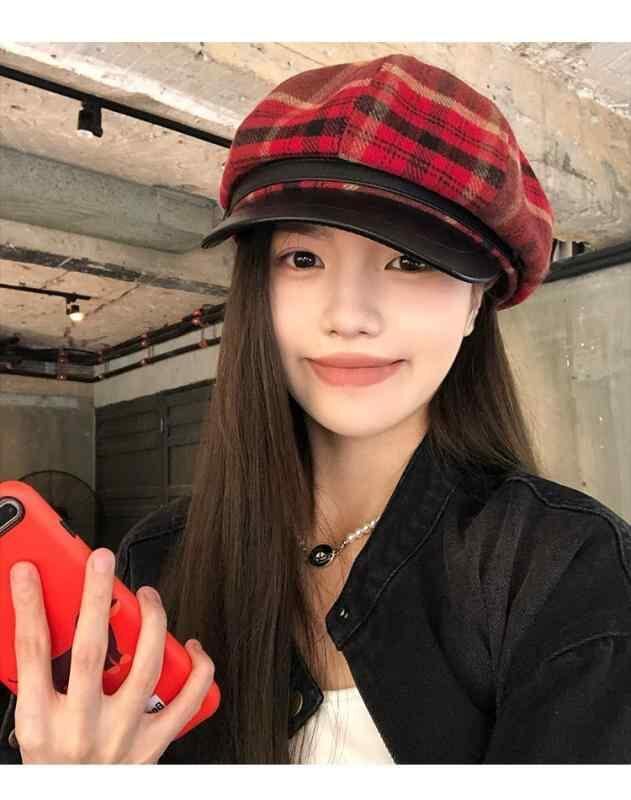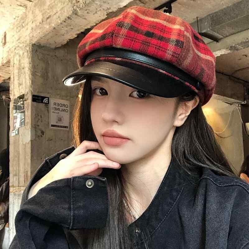 ベレー帽 レディース 赤系 チェック柄 ウール ツイード 綿 キャスケット 八角帽 秋冬 レトロ ブリティッシュスタイル つば付き 通勤 お出かけ 通気性 防風 日よけ 小顔効果