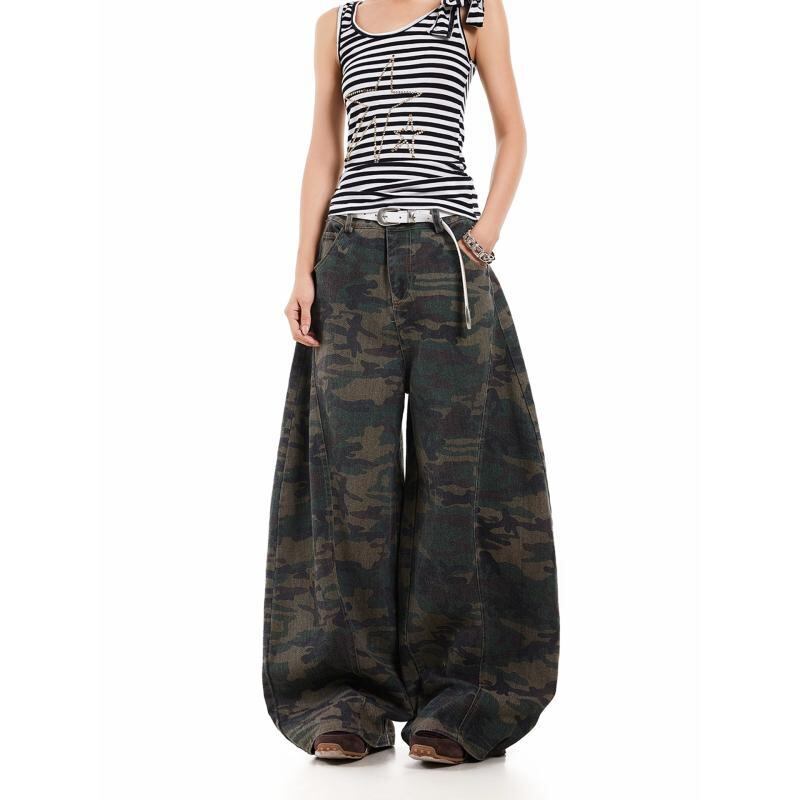 デニムパンツ メンズ アメリカンヴィンテージ ビッグシルエット 再構築デザイン 迷彩 カモフラージュ柄 ストリート カジュアル ゆったり ルーズフィット ユーズド加工 カーブパンツ ハイウエスト コットン フルレングス ノンストレッチ
