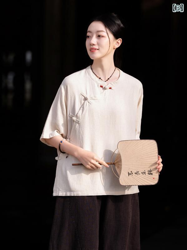 シャツ レディース 春夏 綿麻 リネン 麻 レトロ ヴィンテージ 中国風 チャイナ風 スタンドカラー 立ち襟 薄手 斜め合わせ チャイナボタン 五分袖 ハーフスリーブ ゆったり トップス ブラウス 白 オフホワイト ナチュラルカラー カジュアル