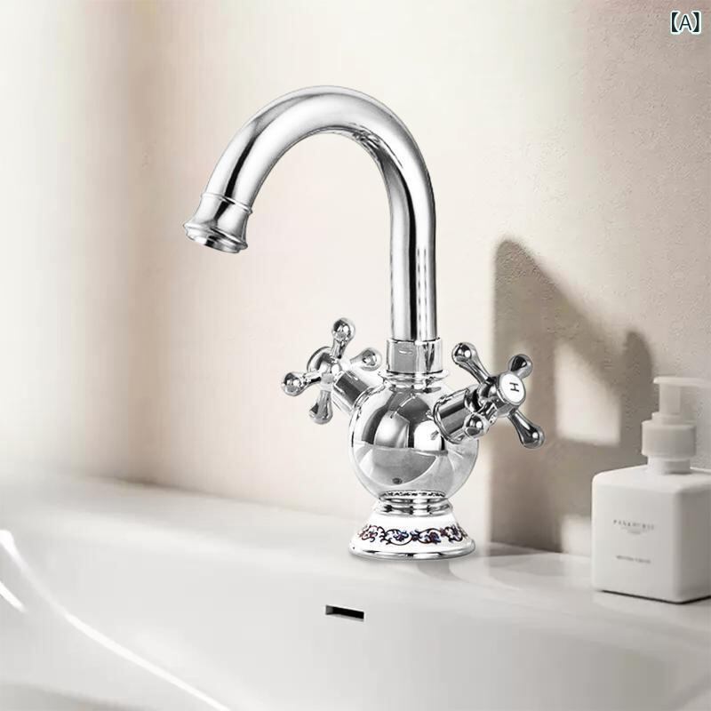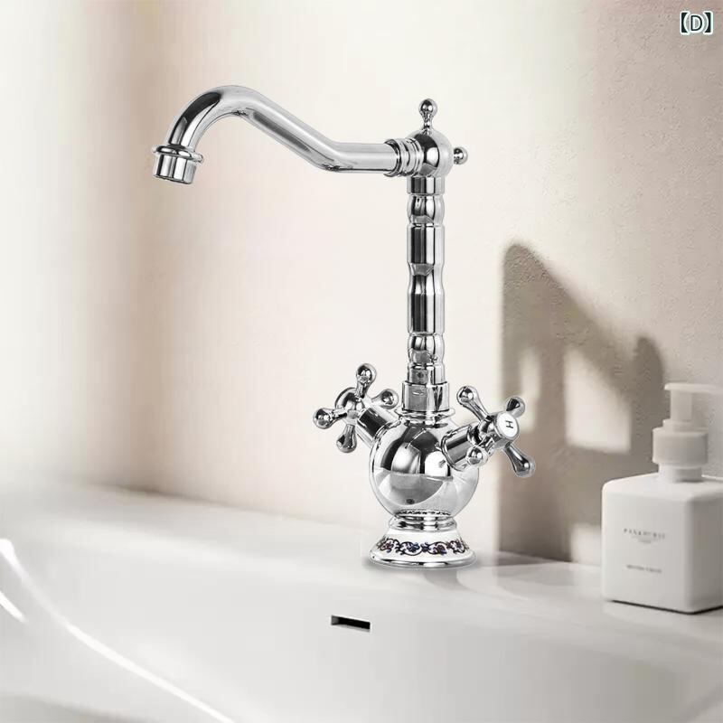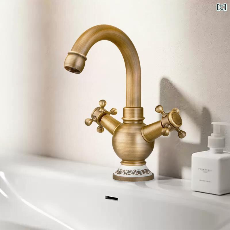 蛇口 銅製 アンティーク調 2ハンドル 混合栓 家庭用 キッチンシンク 台下取り付け ゴールド スクリュー式 ヘアライン加工 電気メッキ加工 セラミックバルブ