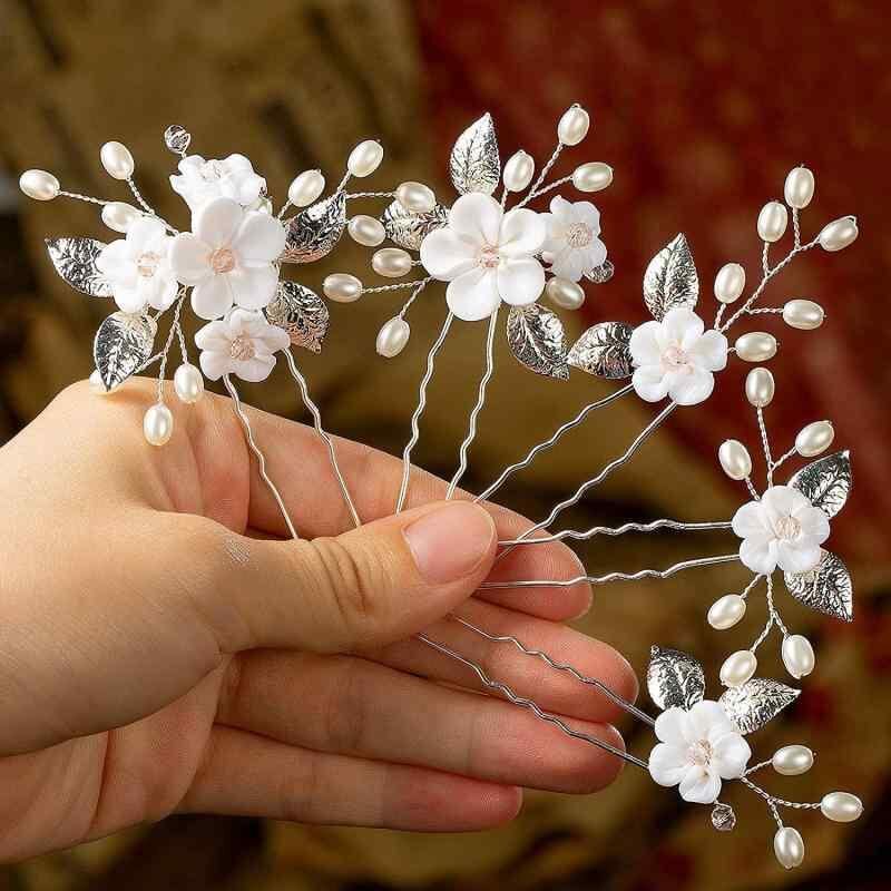 ヘアアクセサリー レディース 5個セット ポリマークレイ 白い花 ピンククリスタル かんざし 簪 Uピン 髪飾り 結婚式 パーティー 和装 まとめ髪 金属製 シルバー ゴールド