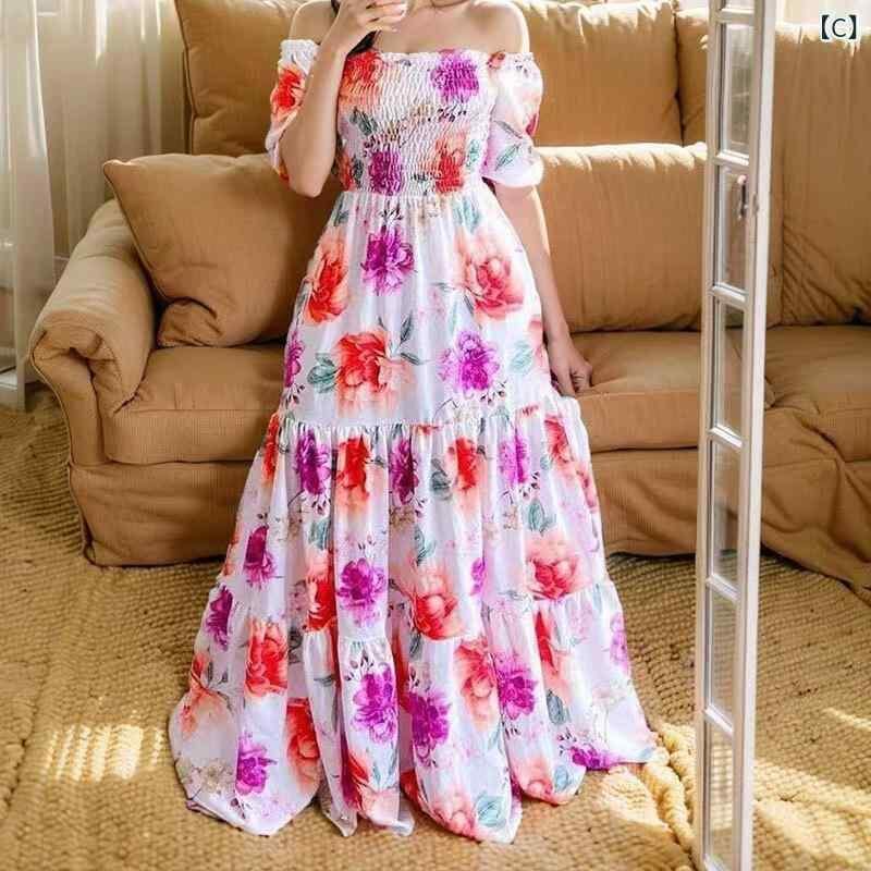 ワンピース レディース 欧米風 エレガント フェミニン オフショルダー フラワープリント Aライン マキシ丈 ウエストゴム フレンチスリーブ 夏 ポリエステル 通勤 リゾート