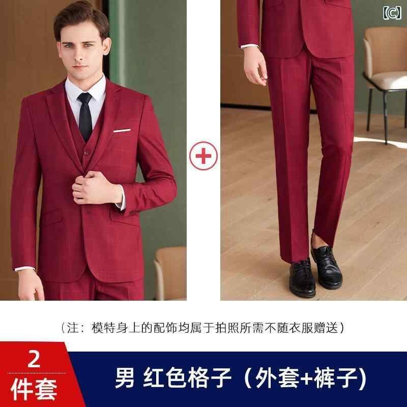 スーツ メンズ 男性用 レッド スリーピース ベスト付き チェック柄 格子柄 ビジネス フォーマル セレモニー 結婚式 ウェディング ブライダル パーティー イベント 披露宴 司会 礼服 スリム 細身 ノッチドラペル 化学繊維混紡
