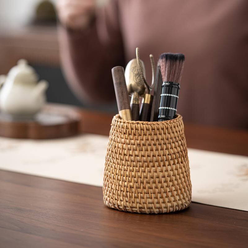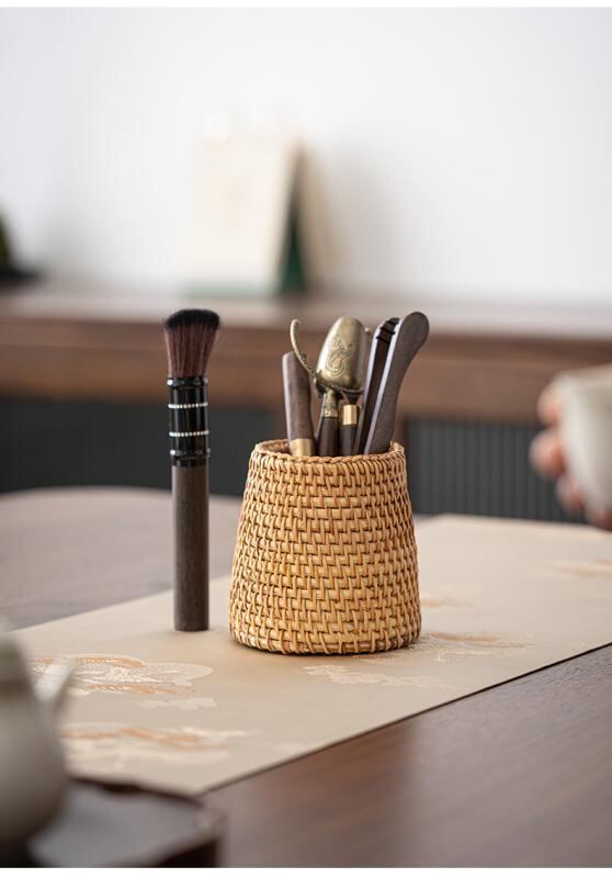 茶道具 藤編み 六君子セット おしゃれ モダン 木製 茶器ツール 茶筒 ペン立て 小物入れ 多機能 収納ケース ティータイム グッズ 和風 インテリア リビング オフィス アースカラー