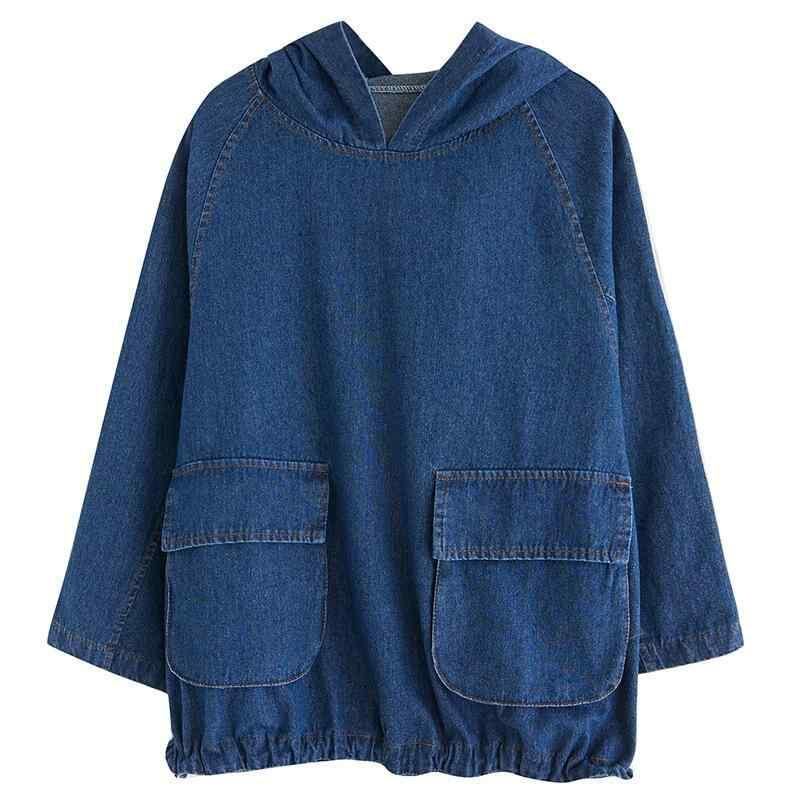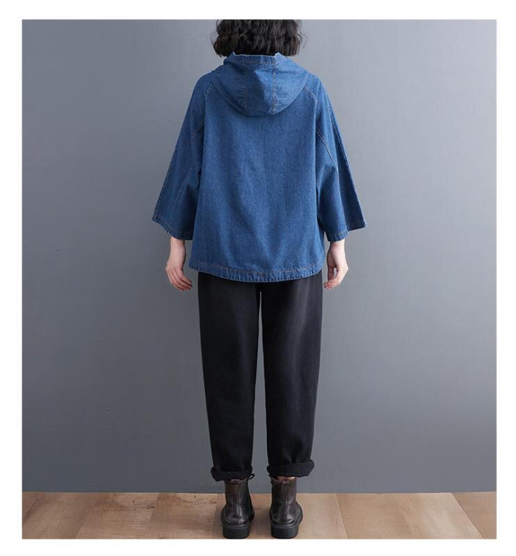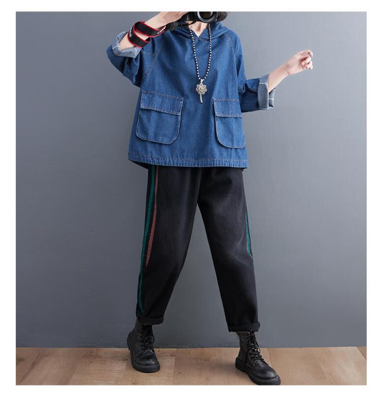 デニムジャケット レディース プルオーバー フード付き ゆったり オーバーサイズ 裾ドローストリング 韓国風 秋冬 カジュアル 通勤 長袖 コットン 綿 無地 ポケット付き ブルー サンドウォッシュ加工