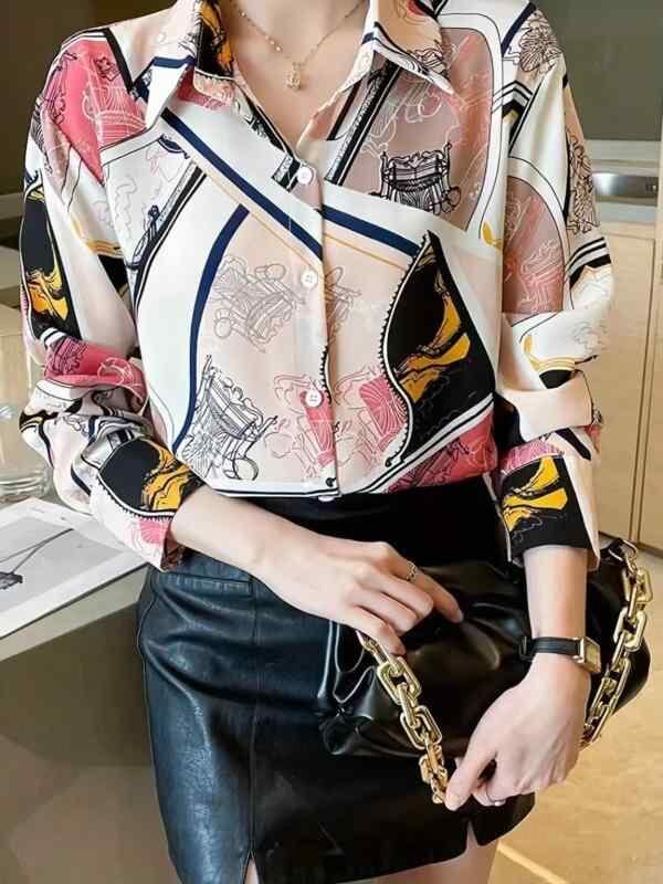 シャツ レディース 女性用 切り替え プリント柄 シフォン ブラウス 長袖 ポリエステル スパンデックス ゆったり ルーズフィット ミドル丈 チュニック丈 通勤 オフィス カジュアル きれいめ 春夏