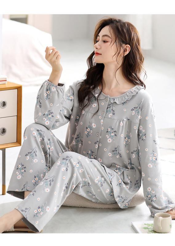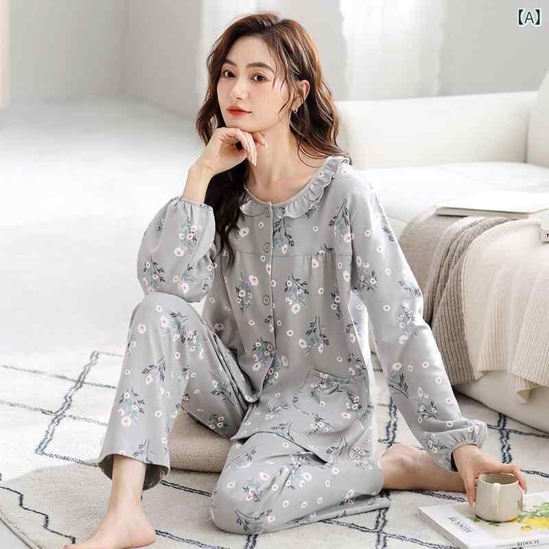 パジャマ レディース 女性用 ミセス 春秋 綿100% コットン 長袖 ロングスリーブ クルーネック 丸首 前開き カーディガン ルームウェア 部屋着 寝巻き 外出着 ワンマイルウェア リラックス 快適 通気性 伸縮性 保温 ロングパンツ