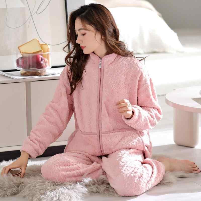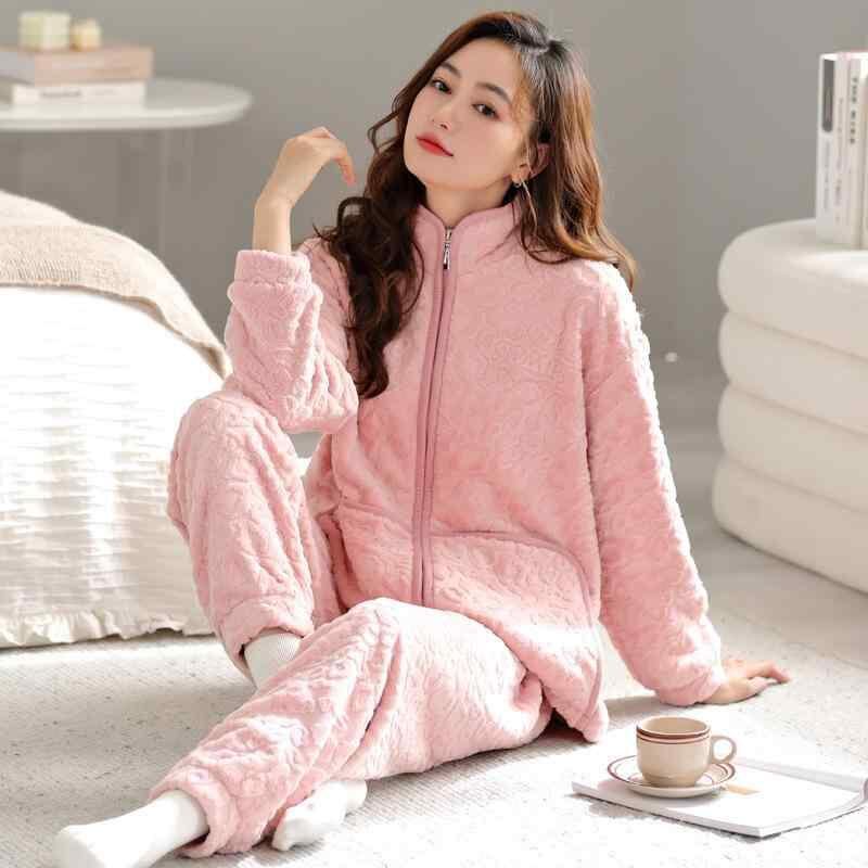 パジャマ レディース 女性用 サンゴフリース フランネル ポリエステル 厚手 裏起毛 保温 防寒 スタンドカラー 長袖 ロングパンツ ジップアップ ルームウェア ワンマイルウェア 秋冬用 極厚 快適 ゆったり カラバリ豊富