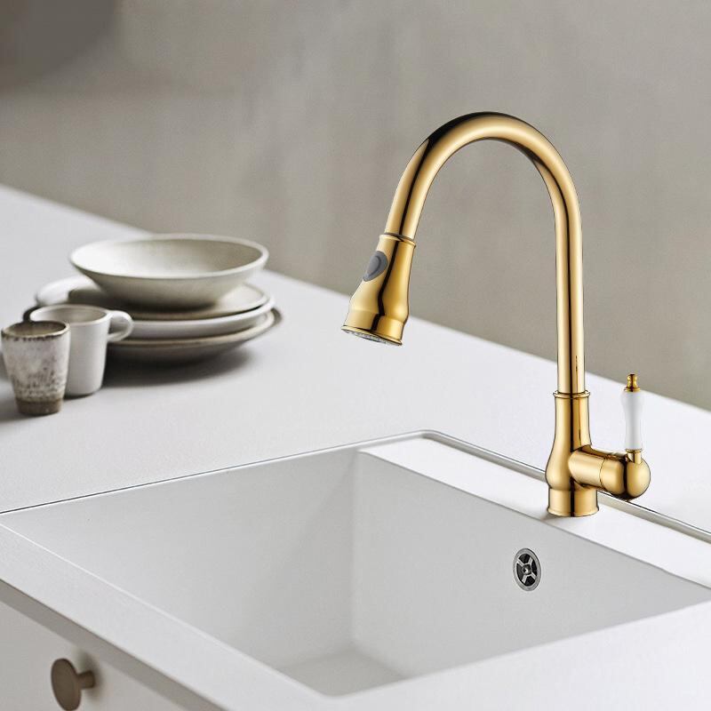キッチン水栓 真鍮製 ゴールド 伸縮式 ホース引き出し式 混合水栓 フレンチ レトロ アンティーク調 シングルレバー シンク 洗面台 流し台用