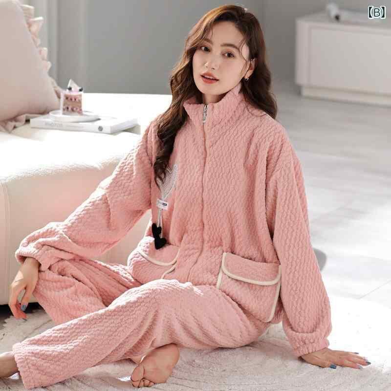 パジャマ レディース 秋冬 厚手 裏起毛 保温 あったか フランネル サンゴフリース ジップアップ 上下セット ルームウェア 部屋着 立襟 長袖 長ズボン
