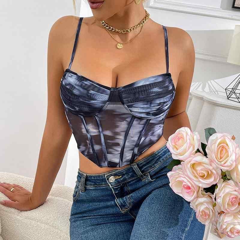 ビスチェ レディース セクシー コルセット キャミソール ワイヤー入り スリムフィット タイト ストラップ プリント柄 グラデーション 切り替え 配色 欧米風 ショート丈 クロップド丈 バックオープン 春夏 ポリエステル 微ストレッチ ブラック ベージュ