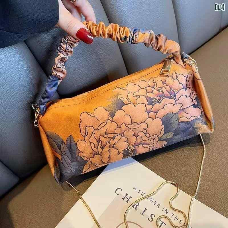 ・カラー展開: 千里江山柄イエロー、香山牡丹柄オレンジ、ブラック竹葉柄、レッド竹葉柄 ・スタイル: 欧米レトロ ・素材: シルク ・バッグデザイン: クラウドバッグ ・人気要素: チェーン ・裏地素材: ポリエステル ・バッグ形状: 楕円形 ・開閉方式: ファスナー ・内部構造: 携帯ポケット ・硬さ: ややソフト ・外側ポケット: オープンポケット ・利用シーン: 日常使い ・ショルダーストラップ: シングル