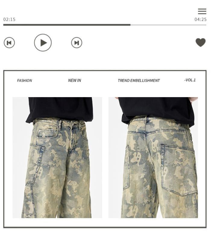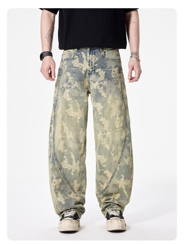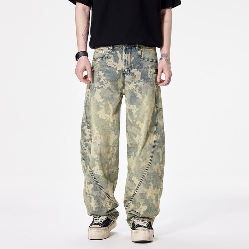 デニムパンツ メンズ カーブパンツ ルーズフィット ストレート 迷彩 ジャカード織り ワーク ストリートファッション 綿 ウォッシュ加工 ユーズド加工 黄土色 マルチポケット 個性的