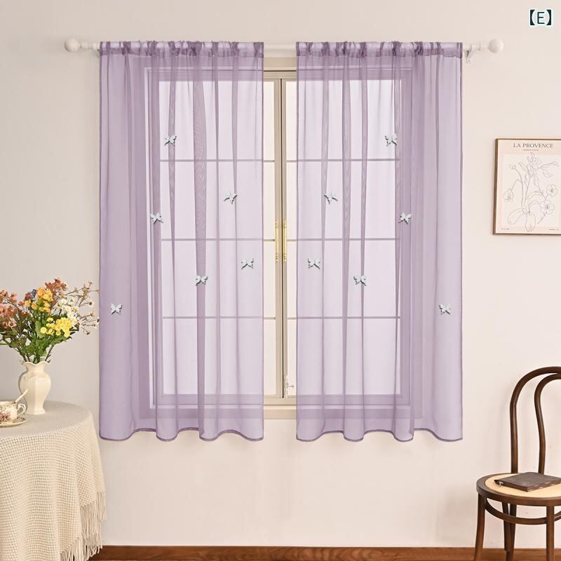 レースカーテン 竿通し 突っ張り棒式 無地 半遮光 ポリエステル モダン シンプル リビング 寝室 ダブル立体蝶ブローチ飾り 多色展開