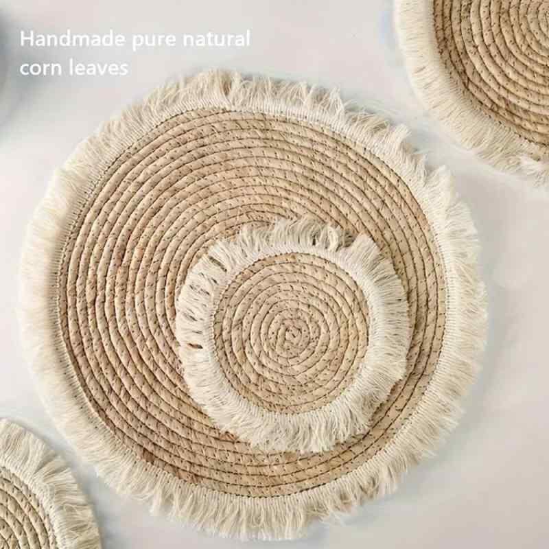ランチョンマット コーンハスク 手編み タッセル付き コースター 鍋敷き 耐熱 食卓用 円形 天然素材 ナチュラルカラー おしゃれ 北欧 キッチン雑貨 インテリア