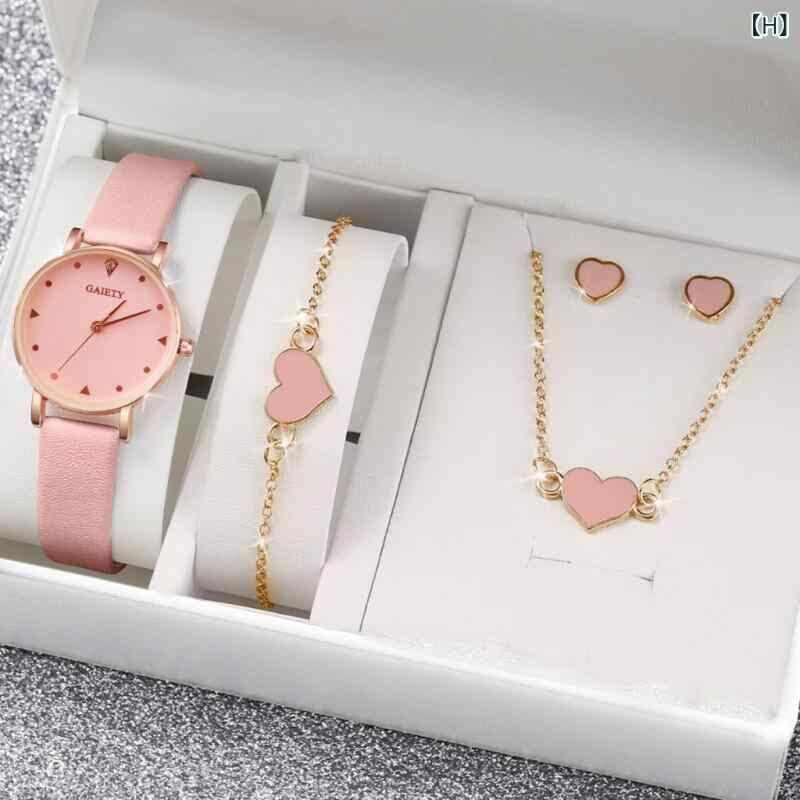 ["・表示タイプ: ポインター","・対象: 女性","・スタイル: カジュアル","・ムーブメント種類: クォーツ","・厚さ: 8mm","・文字盤直径: 32mm","・リューズタイプ: スクリューリューズ","・風防素材: 通常ガラス","・バックルタイプ: ピンバックル","・バックル素材: ステンレス","・バンド素材: フェイクレザー","・文字盤形状: 円形","・ケース素材: 合金","・カラー展開: ホワイト(蝶セット), ホワイト(星セット), ホワイト(ハートセット), ホワイト(ローズゴールドダブルハートセット), ホワイト(クリスタルブレスレットセット), ピンク(蝶セット), ピンク(星セット), ピンク(ハートセット), ピンク(ローズゴールドダブルハートセット)"]