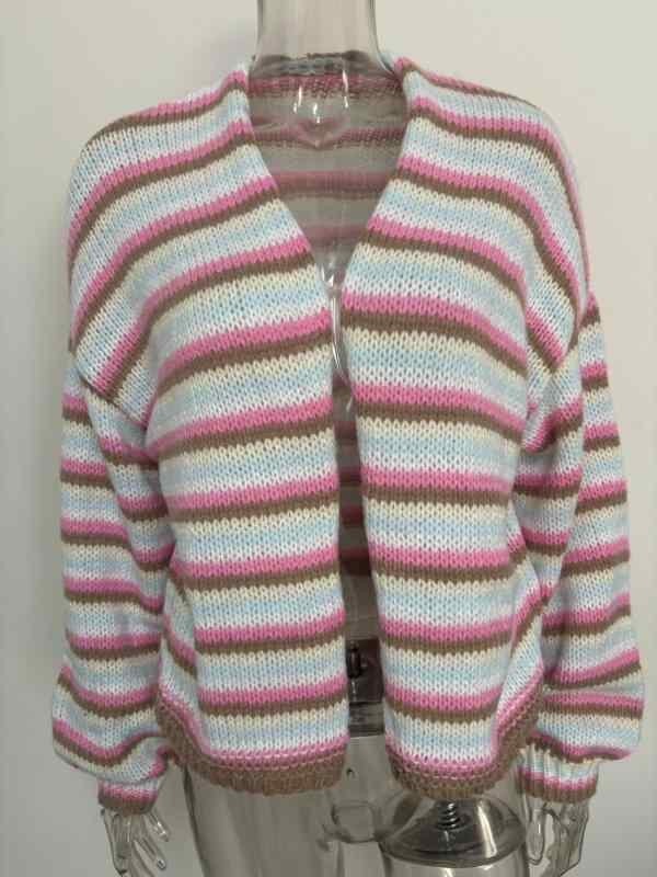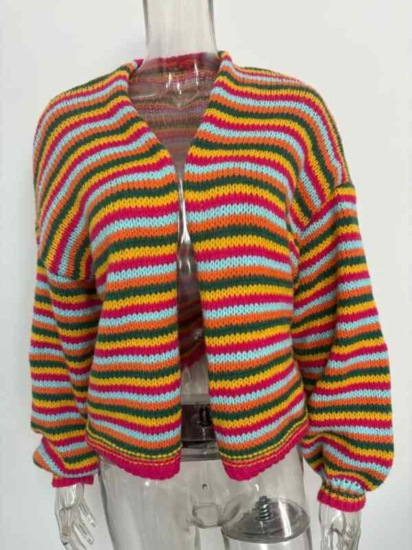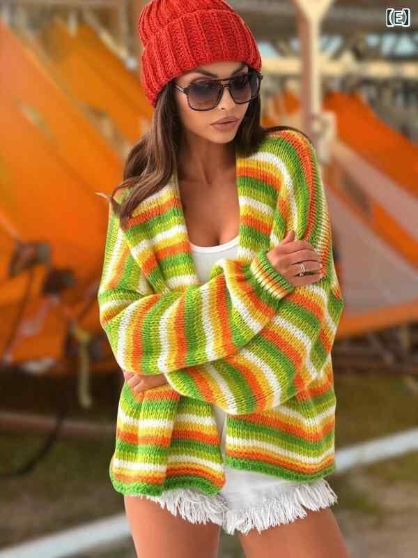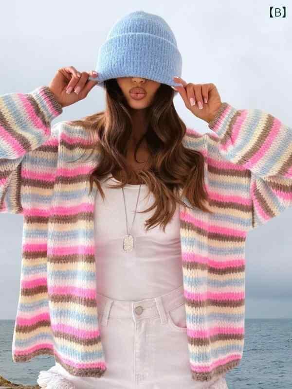 ニット レディース 春秋 ポリエステル混紡 プルオーバー 中厚手 配色 レインボー ストライプ レトロ ラウンドネック 長袖 ゆったり ラグランスリーブ きれいめ 通勤 カジュアル リラックス