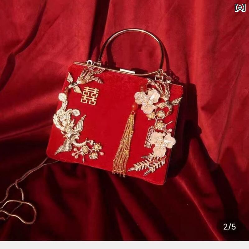 バッグ レディース 中国風 レトロ がま口 結婚式 和装 披露宴 チャイナドレス 手提げ ショルダーバッグ 赤 コーデュロイ 切り替え ハンドメイド フォーマル