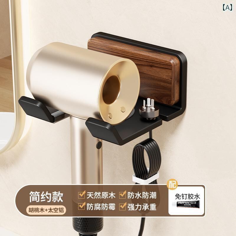 ドライヤーホルダー 穴開け不要 壁掛け 強力粘着 浴室 洗面所 スペースアルミニウム アルミ合金 ウォールナット 胡桃木 木製 モダン シンプル おしゃれ ヘアドライヤー 収納 ブラック