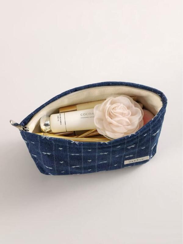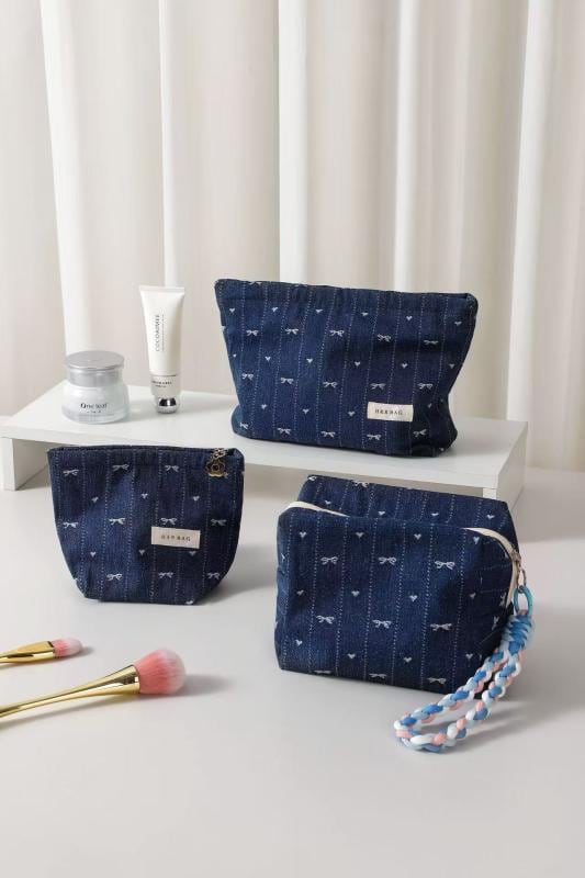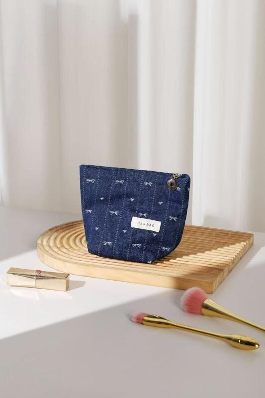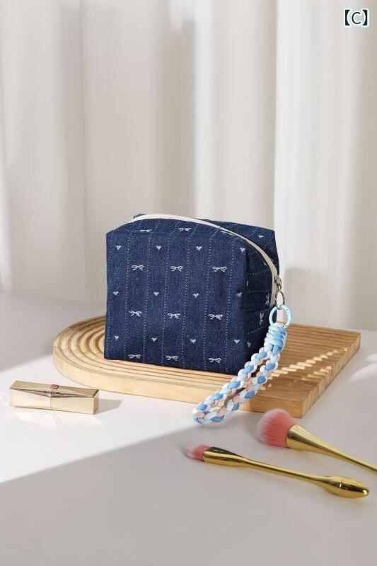 ポーチ レディース レトロ デニム リボン キャンバス生地 メイク収納 スキンケア用品 携帯用 ピロー型 手持ちバッグ デイリーユース カジュアル ダークブルー