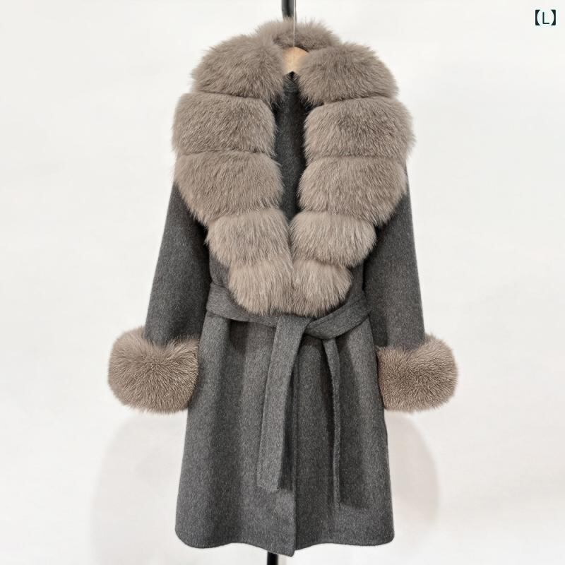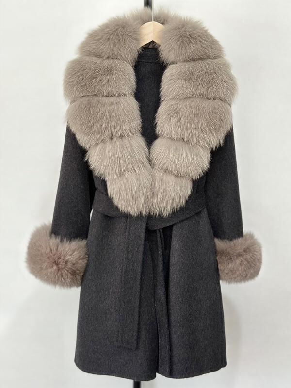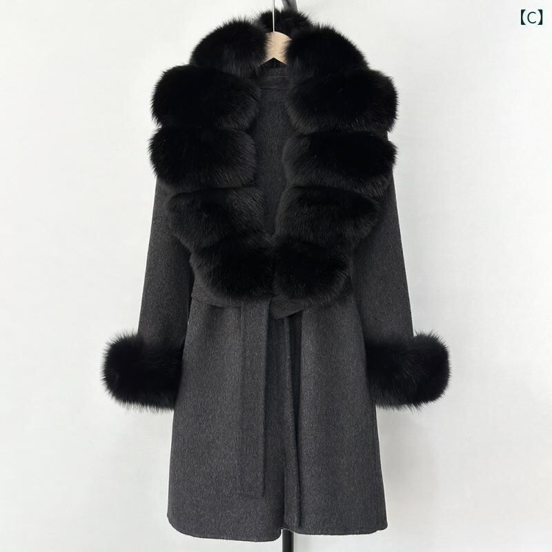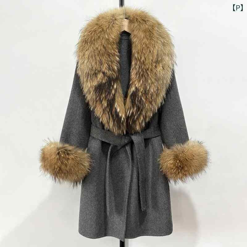 コート レディース 女性用 秋冬 ダブルフェイス リバーシブル ウール カシミヤ ロング丈 スリムフィット テーラードカラー フォックスファー ビッグカラー ベルト付き 上品 きれいめ オフィス 通勤