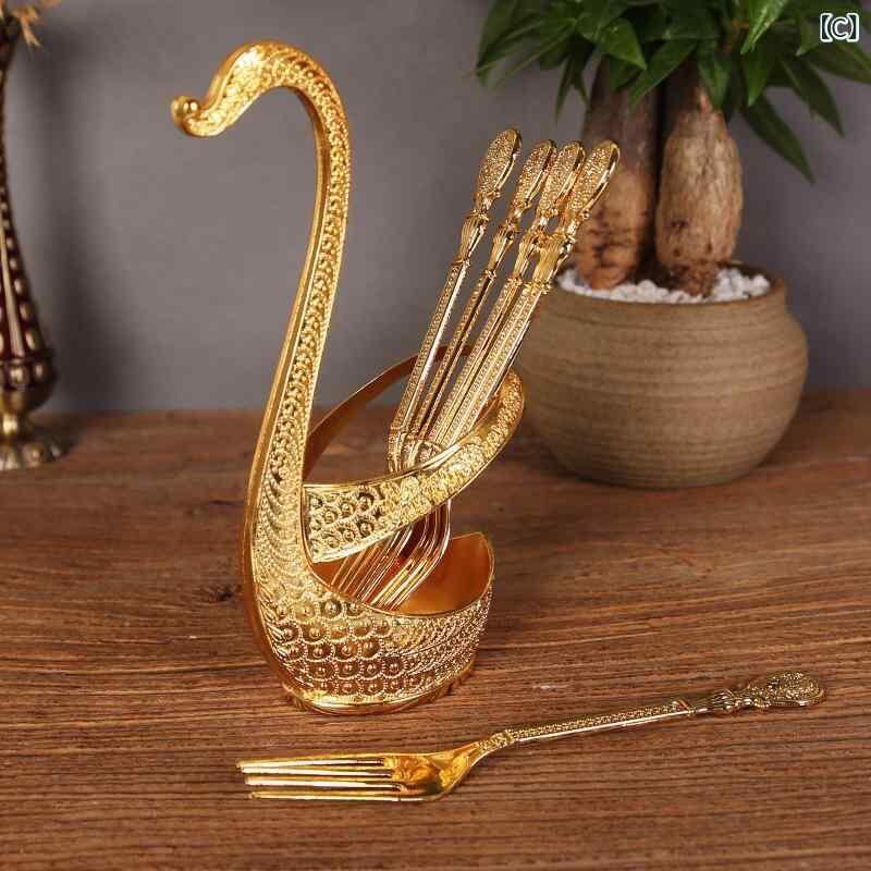 カトラリーセット はくちょう座デザイン 大きめ ステンレス製 ゴールド シルバー フルーツフォーク スプーン 収納スタンド付き 食卓 洋食器 ディナー 来客用