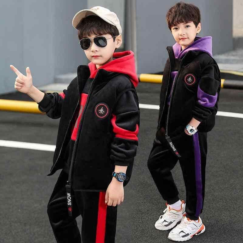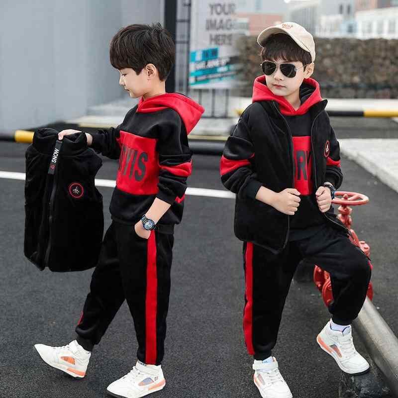 キッズ 男の子用 秋冬 ロングスリーブ アルファベット柄 厚手 暖かい フーディスウェット パンツ 3点セットアップ ポリエステル 通学 普段使い 韓国風 黒