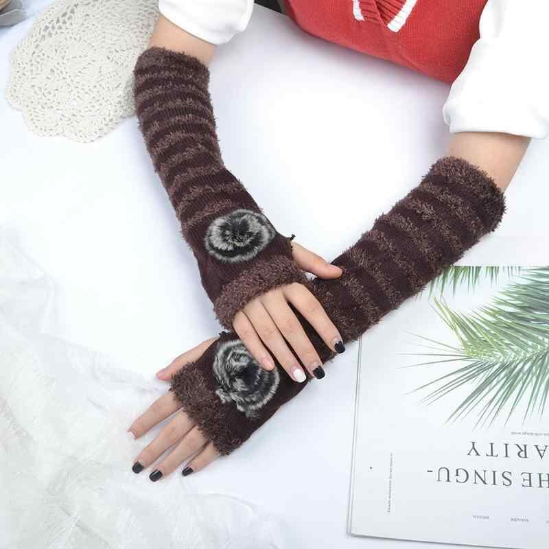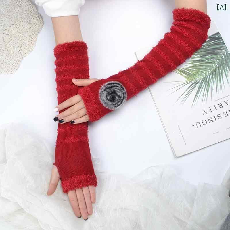 アームウォーマー レディース 秋冬 冬 サイクリング 防寒対策 保温 伸縮性 ロング丈 指穴付き ボーダー柄 ポンポン コリアンデザイン かわいい アクリル 腕カバー